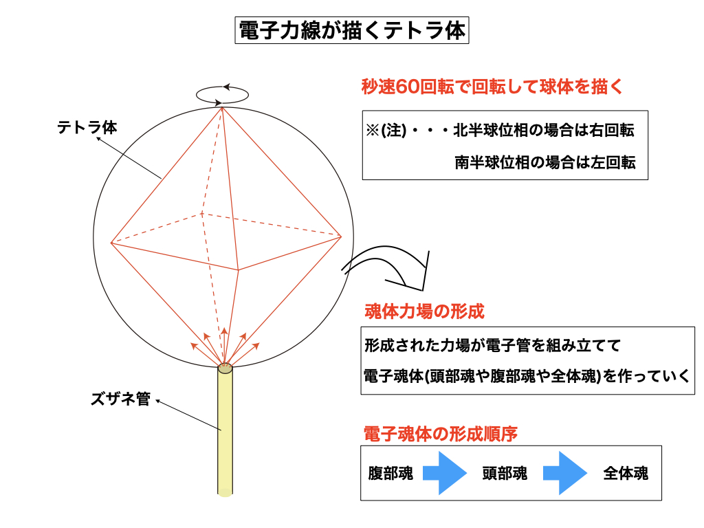 魂体の外皮とも言える「全体魂(オーラ球)」のサイズは直径が約2m大の球体を呈しており、もともとは電子力線が描く正八角錐のテトラ力体ですが、回転している事から力学球形状に見えます。1秒間に約60回転の速度で自転しており、左スピンと右スピンに分かれますが、南半球に位相がある方は左スピンを呈し、また北半球に位相がある方は右スピンを呈しています。一般にペンジュラムが左回転する方は南半球人、右回転する方が北半求人です。しかし、これは左利き(サウスポー)と右利きとは無関係な話であり、利き手に関しては別な要因があります。ちなみに左スピンと右スピンの比率は2対8であり、右スピンの方が圧倒的な多数を占めています。ズザネ管から放出される力学球の力場内部で電子管(キミ管)敷設が行われて、最初は「腹部魂(ヨーア球)」が形成され、次に「頭部魂(ネーミ球)」が形成されて、一番最後に84本から成り立つ「全体魂(オーラ球)」の電磁場が形成されて魂体が完成します。当然、電子管そのものが回転している訳ではありませんが、力学球が右スピンの方は電子管電流の方向も右回転であり、ヨーア球もネーミ球もまた全体のオーラ球も同じ方向に電流が流れており「右磁場」を呈しています。無論、力学球が左スピンの方は左に電流が流れており「左磁場」を呈します。