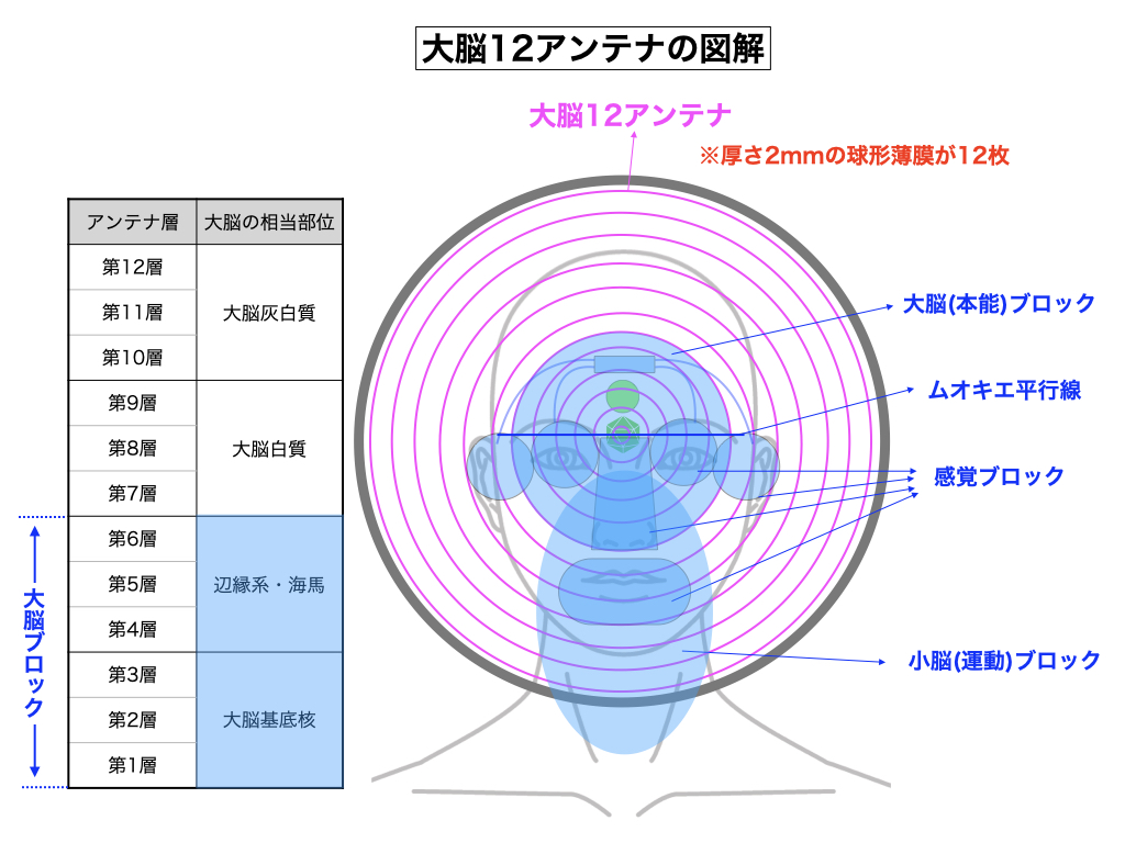人間の頭部領域をスッポリと囲う12枚から構成される同心状の空洞球体であり、一枚の球体層の厚さは約2mm程度である。早い話が厚さ2mmの球形薄膜が同心球状に大脳全体を取り巻いているのが大脳12アンテナの実体である。このアストラル器官とは上空の地球力場に存在する自己の心動帯(ヌクヒブイ動帯)の同会先を操作する「遠隔操縦盤」であり、心回路(精神回路)と直結する非常に重要な器官である。アンテナの第12層から第10層までの外側の領域は「大脳灰白質」に相当しており、また第9層から第7層までは「大脳白質」に相当し、第6層から第4層までは大脳の「辺縁系」や「海馬」などの領域に相当している。第3層から第1層までは「大脳基底核」に相当し、第1層の中心部には「頭部魂オーブ核」が位置している。第6層の辺縁系領域より下にはアストラル器官の一つである「本能ブロック」が存在しており、この本能ブロックの内部に「オーブ核」や「ロエフ球」が存在し、物質的には辺縁系、海馬、大脳基底核などの中心部は全て、この本能ブロックの内部に存在している。他にも「小脳ブロック」や四種の「感覚ブロック」の全てを、大脳12アンテナは包括している。