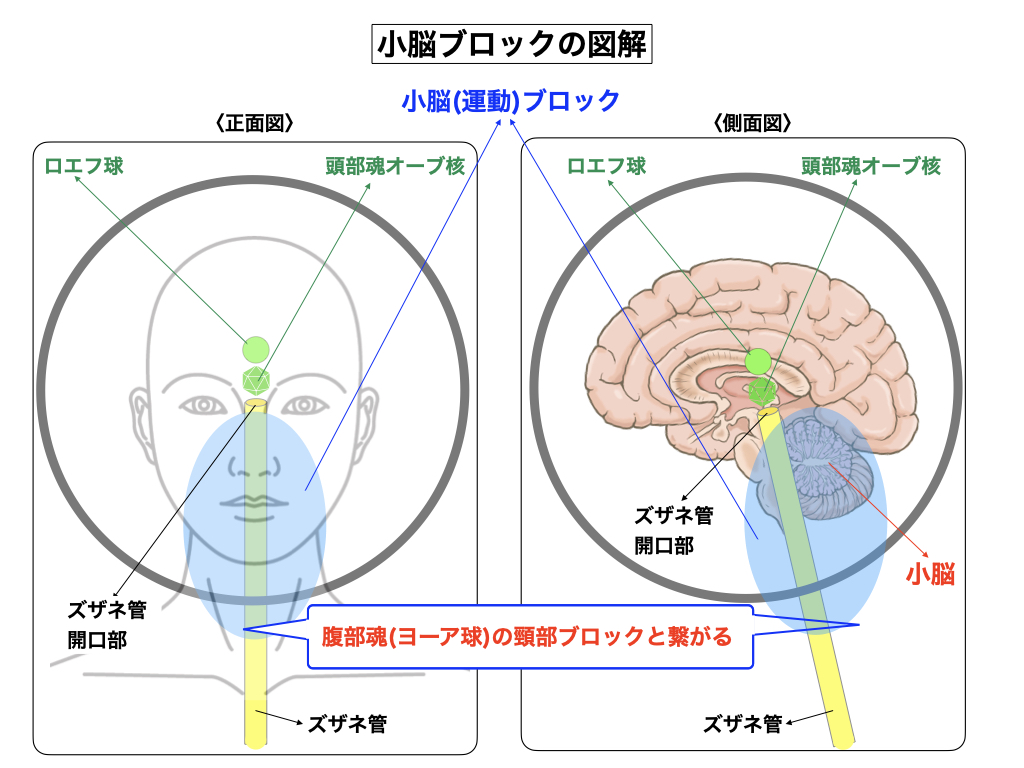 小脳を包み込むアストラル器官の一つであり、サイズ的には二番目に大きな器官である。全身の随意運動(筋肉運動)に関係する器官である事から「小脳運動ブロック」と称している。腹部魂(ヨーア球)の「頸部ブロック」と直接繋がっており、全身の運動に関係する中枢司令塔の役割を担っている。と表現するよりも、「小脳運動ブロック」とは小脳を操作しコントロールしている所の「小脳の本体(頭脳)」であると言った方が早い。