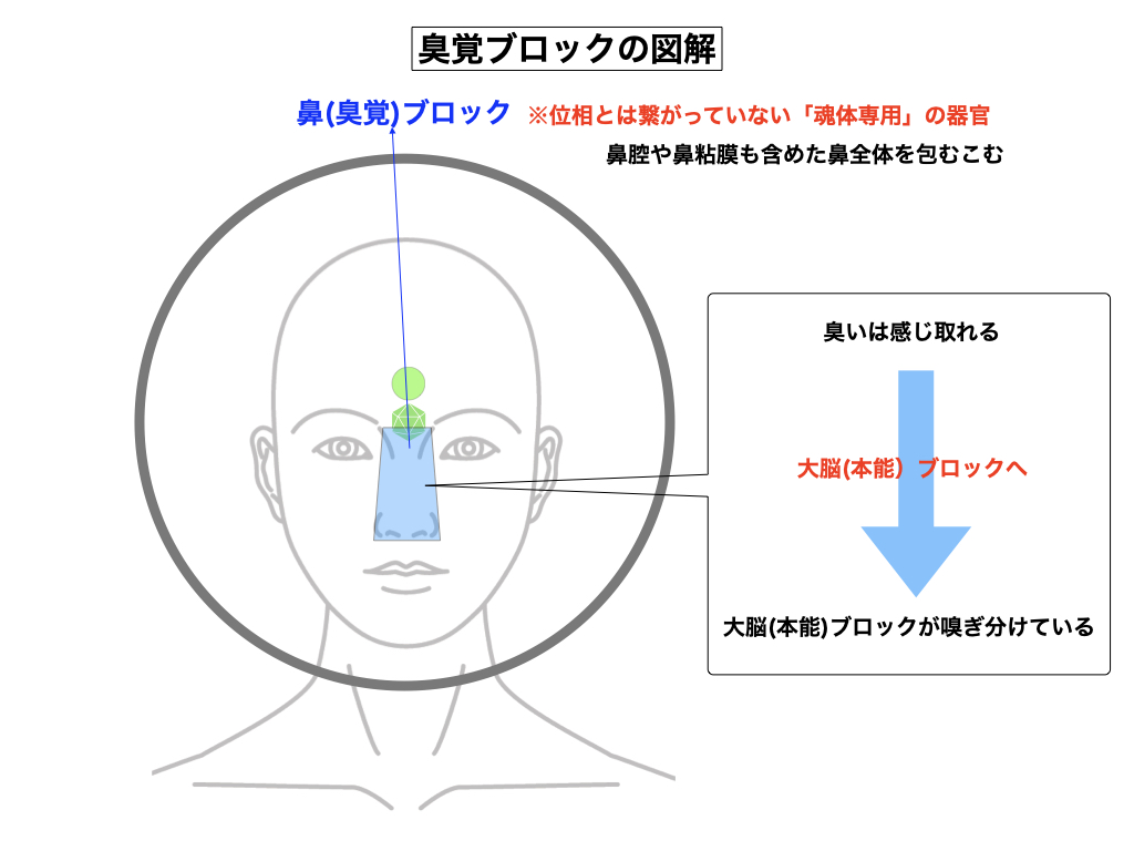 「臭覚ブロック」とは鼻腔や鼻粘膜も含めた鼻全体を包み込む長形のアストラル器官であり、下記の「味覚ブロック」と同様に位相とは繋がっていない魂体専用の地上の器官である。「臭覚ブロック」で臭い自体は既に感じ取っているが、それを「本能ブロック」に送って分析し、何の臭いなのか嗅ぎ分けている。