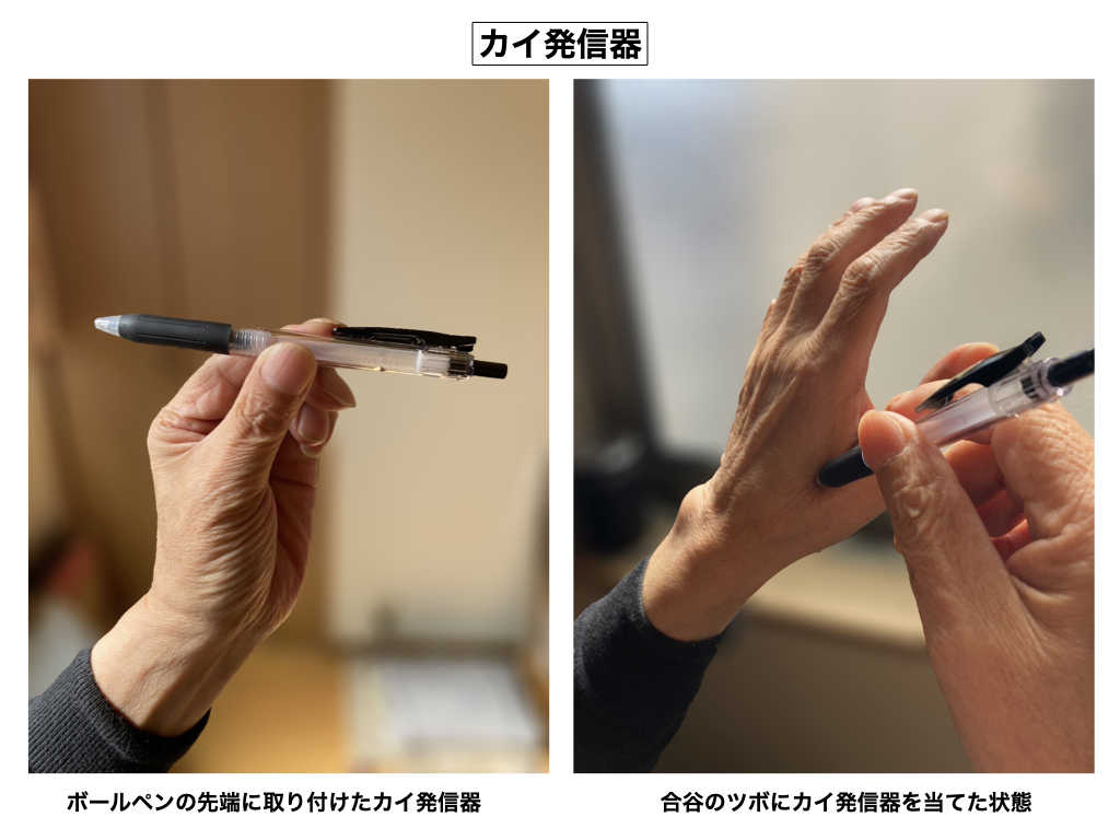 ※ カイ発信器の本体は長さ2cm太さ3mmのアストラル装置であり、ボールペンの先端部やツボ押し器の先端部に取り付ける事が出来ます(寿命は2年間)。写真はボールペンの先に取り付けた実物のカイ発信器、手の「合谷」のツボに当てると胃が動き出します。ところで、身体のヒール・キジ点(ツボ点)の直径は5mm以上ありますが、手足のツボ点の直径は小さく1.8mm程度のサイズになります。