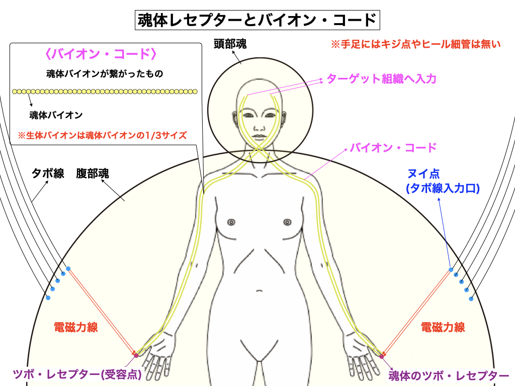 生物の手足は身体の内部と違って、大半が随意筋(骨格筋)から成り立っており、主に心(魂体)の指令に基づいて動きます。手足は魂体が一番活躍できる運動器官だと言えます。従って、魂体球のヌイ点から発射されるタボ線の電磁力線は魂体のツボの受容器(レセプター)へ伝わります。魂体の受容器は力学系の産物では無く、電子バイオンで構成されている事から、早い話が受容器とは力線を磁気信号へと切り替える「変換器」であって、この変換器からターゲットの組織までは「バイオン・コード(Bコード)」で伝わります。身体の場合は「ヒール・キジ点」から「ヒール細管」を介して物理刺激が伝わりましたが、魂体の場合は「レセプター」から「バイオン・コード」を介して信号が伝わると言うシステムなのです。従って、魂体のツボからは物理信号が伝わら無い理由から、鍼灸の効き目が無い訳であり、カイ発信器の様な「道具」が必要となります。手足のツボの場合は「魂体レセプター」から、何処の組織へ、何本のバイオン・コードが伸びているか、それが重要になります。ちなみに、ヒール細管は短いが、バイオン・コードは長いのが特徴であり、こうしたカイ発信器を用いたツボ刺激療法は薬剤を使わない宇宙医学に於いては、医師が身に付けるべき医療技術でした。