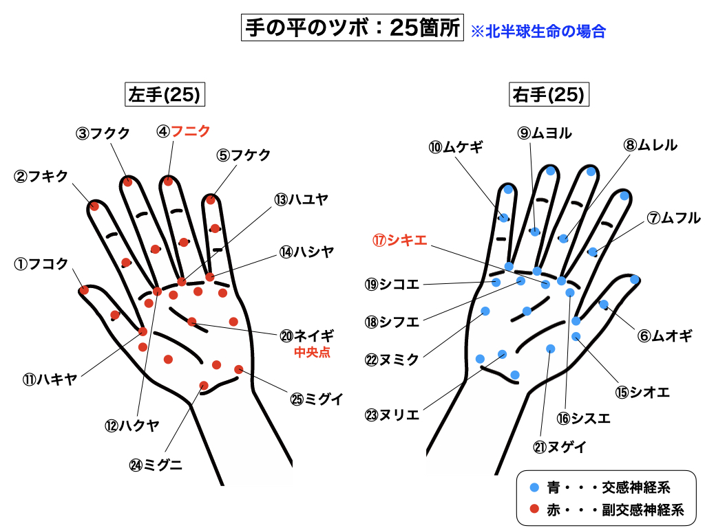 20) ネイギ(中央点)・・・左右の手の平の中央点からは3本のBコードが出ている。いずれも魂体を介して頭部魂の中央(大脳基底核)に存在する「自律神経」の根幹部に入力している。3本のBコードの入力先は1本が変電所である「ノクヒ」へ、1本は増幅減圧器である「黒質網様部」へ、もう1本は自律神経の本管の根本(出入り口)である。左手のツボは電流の「帰り道」である「副交感神経」へ、また右手のツボは電流の「行き道」である「交感神経」へ入力している。このツボの効用は自律神経失調症の患者のみならず、健常者でも定期的に刺激を与える必要がある。ツボ治療の際には左右とも必ず打つべきツボの一つである。