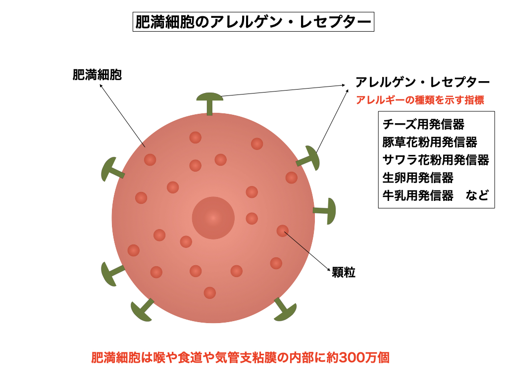 肥満細胞の一つが「水ラジカル」や「RAD分子」を吸引して細胞膜の一部がラジカル化すると、細胞ヒールがラジカル分子に反応して「超過敏状態」となり、軽率な行動を次々と連発してしまう。たまたま、その時チーズを食べると、チーズの一部がラジカル化しているのを見て、チーズ自体を「敵」であると誤認識をし「警戒警報」を発令してしまう。一人の門番だけならともかく、数十人の門番が一斉に騒ぎ出せば、今度は身体内部の免疫軍が一挙に発動を開始し、侵入した敵を探し回るが、敵の姿などどこにも無い。早い話が「似非警報」なのである。免疫軍の一斉発動によって「アナフィラキシー・ショック」を起こす場合もある。こともあろうに、お馬鹿な門番達は自分が一度キャッチして遭遇した相手を忘れない為に、「アレルゲン・レセプター」なる物を自己の細胞膜に作り上げる。これによって、チーズが食道に再侵入した場合は自動的に「警戒警報」が発せられる様にしてしまうのである。何と馬鹿げた話であろうか。そのお陰で、チーズ・アレルギーの子供は生涯チーズを食べられないのである。