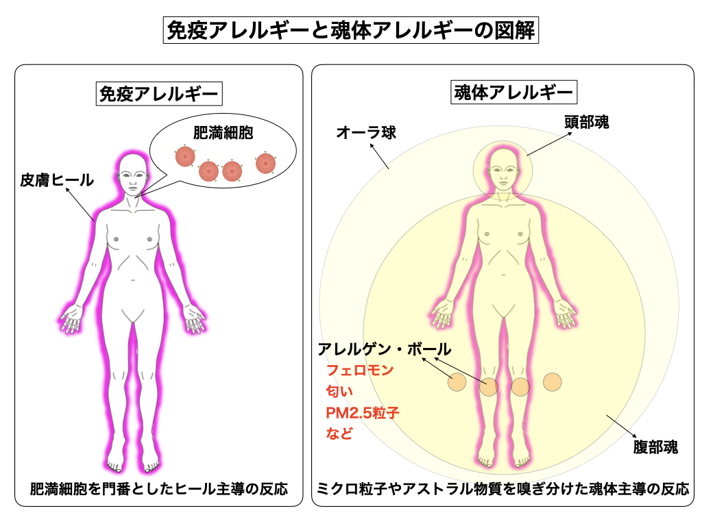 免疫アレルギーの場合は門番細胞の細胞膜上に生じる「アレルゲン・レセプター」がアレルギーの種類を指す「標識」であるが、魂体アレルギーの場合は魂体の腹部魂の足元に「アレルゲン・ボール」なるものが標識として出現して来る。医療団はその標識を見て、何に対して反応しているのか、直ぐ読み取る事ができる。例えば免疫系のアレルゲン・レセプターであれば、スギ花粉とかチーズとか卵白とか電磁気とか有機溶媒に反応している事が分かるのだが、それと同様に魂体系のアレルゲン・ボールを見れば、魂体が嫌がっている相手が直ぐ分かる。女王蜂フェロモンなのか、雌猫のフェロモンなのか、家ダニのフェロモンなのか、あるいは薔薇の花の匂いなのか、自動車の排気ガスなのか、放射性微粒子(RADガス)なのか、PM2.5粒子なのか、もしくは霊体侵入なのか、物質系では感知が難しい「臭い系分子」や「ミクロの粒子群」や「アストラル物質」などを魂体は嗅ぎ分けているのである。それともう一つ、ヒール系(肉体系)は免疫軍を操作するのに対して、魂体系はリンパ軍を操作している。リンパ球が異常の動きを見せている場合は「魂体主導」であると理解する必要がある。