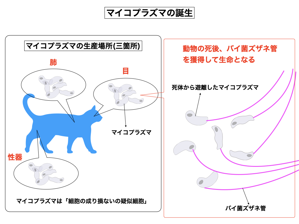 この病気は最初は上気道から感染し、副鼻腔炎(鼻炎症状)や気管支喘息を引き起こし、更に肺の内部へと徐々に進行して行く。宇宙医学の対処法としては、先ずは患者の酸素を確保しながら「マイコプラズマ」を医療団に処理してもらう事である。マイコプラズマは簡単に細胞内部へ出入り出来る理由から、細胞内部のマイコを探し出して処理する事が大変な作業となる。無論、マイコプラズマは細胞体であり、呼吸ブースの自動排出は効かず、基本的に医療団の手取りとなる。細菌と違って処理に時間は掛かるし、また細胞内に増殖用のDNAを打ち込んでいる理由から、それらも除去しなければならない。コロナ禍の最中に爆発的にマイコプラズマが増えて、家族全員がマイコプラズマに感染すると言った事態を、医療団は何度も経験している。動物種(哺乳類)の違いによって、感染力も違って来るが、医療団に取ってはマイコプラズマは強敵である。マイコプラズマは動物の「死体」から遊離して誕生して来る。当然、人間のマイコプラズマも存在しており、遺体はなるべく早く焼却しなければならない。