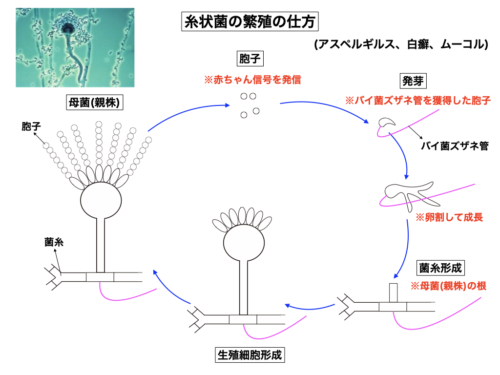 上記に示したのが「アスペルギルス菌」や「ムーコル菌」や「白癬菌」などの糸状真菌類の繁殖の仕方である。受精を済ませた一つの雌型胞子(受精卵)が漂着すると、やがてそれは「赤ちゃん信号」を放って「天のズザネ管(バイ菌ズザネ管)」の入力を待つ身の上となる。運よくズザネ管を招き入れて接合ができた場合は、母菌(親株)への成長が許される事になり、受精卵は卵割を繰り返して成長し、そこに根を張って一人前の母株となる。母株になると内部で「胞子形成」が始まり、普段は一般胞子を生産して吐き出しているが、時期が来ると減数分裂を行い生殖用の雌型胞子と雄型胞子を生産し、自己の複製を作って世代を継ないで行く。母株にはズザネ管が入力されているので、医療団は位置を特定できるが、この母株の命を完全に奪わないと退治した事にはならない。
