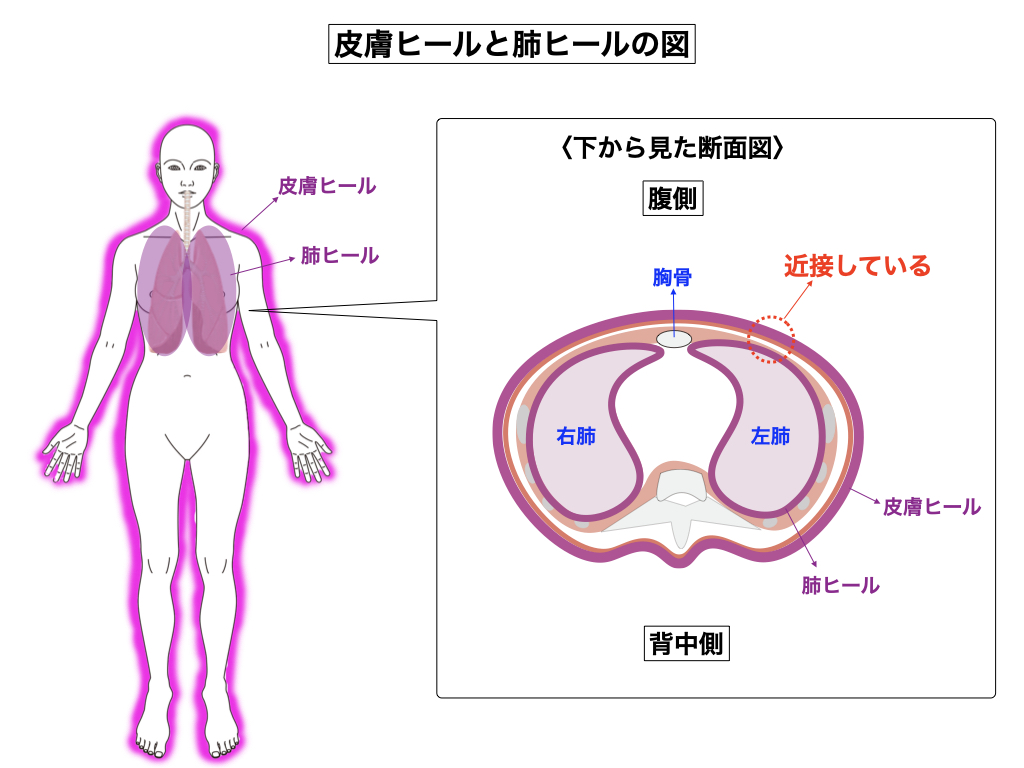 ④ 自然気胸・・・怪我や事故の物理的な損傷で胸膜に穴が開き、膜組織に空気が入ってしまう事を「気胸」と言う。空気が入ると肺組織が圧縮されて呼吸がしにくくなる事は承知の通り、また空中から雑菌が直接流入する恐れもある。しかし、不思議な事に何もしていないのに突然気胸が発生する場合がある(自然気胸)。一体何の原因で突然穴が開くのか、それは物質世界では理解不能な話である。人間の目には見えないが、両肺には4本の臓器コリン電線が走っており、四つの電磁場が形成されている。その電磁場を上から包み込む様に「肺ヒール(臓器ヒール)」が取り巻いている。また人体は「皮膚ヒール(全身ヒール)と呼ばれる一枚岩のヒール球の内部に在って、更にそこには複数のヒール腔も存在しており、肋骨一本一本も「骨ヒール」に包まれている。肺組織は基本的に「臓器ヒール」の管轄下に在って、内部の胸膜組織もまた中心部の肺組織もそれらを構成する細胞群は「臓器ヒール細胞群」と呼ばれる。彼等は「ヒール・ズザネ管」や「ヒール・タボ線」と直結した精鋭部隊なのである。さて問題は、肺の「臓器ヒール」と「皮膚ヒール」がかなり隣接している関係上、時折、誤入力問題が生じる場合がある。