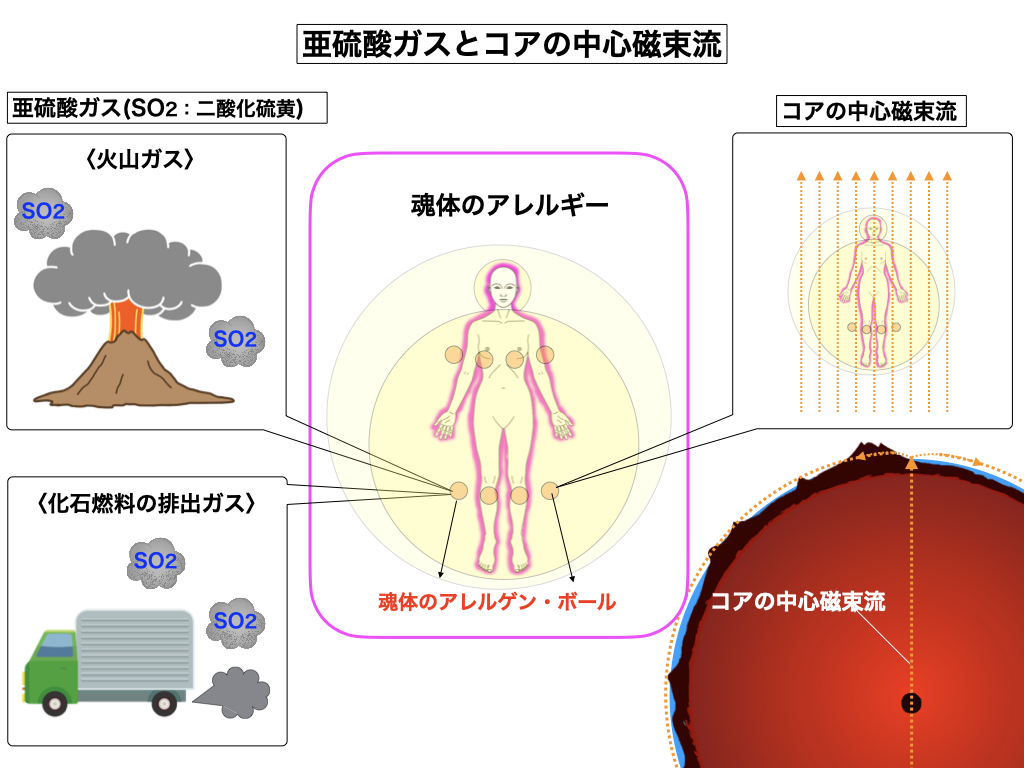 ※ 胸痛症候群・・・思春期から20歳代までの感受性が高い若い男女が訴える胸痛障害で、身体を動かす度に胸を針で刺される様な鋭い痛みや、あるいは胸をえぐられる様な強い鈍痛や、胸を締め付けられる様な痛みを訴える患者が増えて来ている。成長期の若い世代に多い事から、骨の発育や筋肉の発達と関係があるのてはないかと現行の医学会ではそう推察している。我々も数人の若い男女からそんな話を聞いてはいたが、年配者には余り現れない症状なので真剣には取り扱わなかった。しかし、患者が急増している事実を知って解析せざるを得なくなった。軍団による調査の結果、胸痛症候群の根本原因が「魂体のアレルギー」によるもので、魂体の「胸ブロック」に反応する二種類の「アレルゲン・ボール」を、多くの若者達が有していた。このアレルゲン・ボールは一つは「亜硫酸ガス(SO2: 二酸化硫黄)」、もう一つは「コアの中心磁束」に反応しており、それが腹部魂の「胸ブロック」に症状として現れていた。亜硫酸ガスと言えば、火山ガスや化石燃料の排出ガスであり、空気より重く酸性雨の原因物である。我々の時代は排気ガスの中で育っているが、今の時代の子供はこの程度のガス量にも敏感に反応するのかと驚いた。