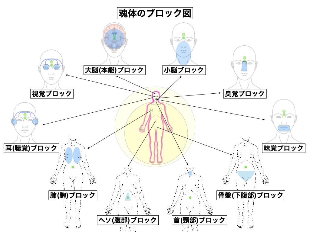 一般に、「魂体アレルギー(体感受アレルギー)」は、抗原がフェロモンや臭い分子の場合は主に「首(小脳)ブロック(鼻や喉や気管支)」に症状(空咳や喉の違和感)が出るが、抗原が音の場合は「耳ブロック」に症状(ノイズや耳鳴り)が出て、また抗原が亜硫酸ガスの様な大気成分の場合は肺に直接到達してしまう事から、主に「胸ブロック」に症状(痛み)が出る。また抗原がコアの中心磁束流となると、全てのブロックが同時に反応を起こす。魂体が一体何に拒絶反応を示すか予測が出来ない故に、我々は魂体にアレルゲン・ボールが形成され次第、無条件でそれらを切断している。また「免疫アレルギー」も一緒の扱いであり、肥満細胞の「アレルゲン・レセプター」が形成されると、それを無条件で切り落としている。体が嫌がっているのに無視して良いのかと言う意見もあるが、陽化が極まって何にでも反応する環境下故に、体の好き嫌いに、いちいち付き合ってはいられ無い。子供の小麦アレルギーには付き合い切れないので、「小麦アレルギー」のレセプターをカットしてやれば、少なくてもアナフィラキシーを起こして死ぬ事は無い。バッサリやってしまうのが一番である。体は所詮「機械生命」、甘やかすのは良く無い。