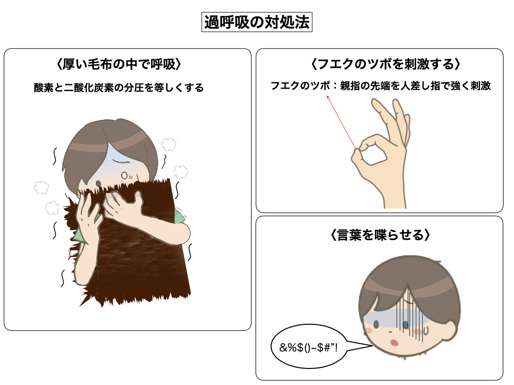 さて、自分の目の前で「過呼吸」を引き起こし倒れた人間を無視して立ち去る事はなかなか出来ないだろうと思われる。一番良い方法は炭酸ガスを吸引させて、偏った酸素と二酸化炭素の分圧を等しくしてやる事だが、厚い毛布を口に被せて、その毛布の中で呼吸させるのが一番良い方法だと思われる。自分が吐き出した炭酸ガスを再吸収できるからである。それともう一つ方法がある。毛布呼吸をさせながら、親指の先端と人差指の先端を合わせて、両方の指で丸を作り、人差指で親指の先端を強く刺激する方法である。親指の先端には「フエク」のツボがあり、このツボは過呼吸のツボとも言われている。それともう一つ方法がある。それは本人に何でも良いから、言葉を喋らせる事である。言葉を喋れば「第1磁界」のド壺の底から抜け出す可能性が高くなるからである。先ず、心を地獄の底から引き摺り出してやらないと、本人は自力で自身の体を立て直す事が出来ない。