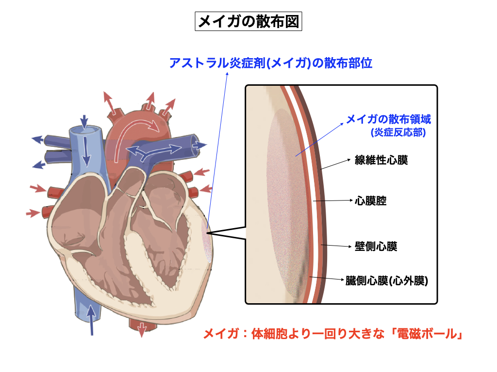 心筋炎と言えば、普通は「感染症」であり、細菌やウイルスやマイコプラズマや真菌などによって引き起こされていると医者の誰もがそう思っている。実際、幾つかのウイルスが心筋炎を引き起こす事実は我々も確認している。主に4種類のウイルスであり、一つは「コクサッキー・ウイルス(ヤモリ・ウイルス)」であり、後のウイルスは「鵜(う)・ウイルス」と「カエル・ウイルス」と「ビーバー・ウイルス」と言う三種である。心筋炎の自然発生は主にこの4種類のウイルスによるものであるが、残りの大半が魔界武器移植に伴う二次的な感染であり、先に炎症反応を誘発させておいて、それに乗じて致命的な病原体を招き入れる(呼び込む)と言う手の込んだ手法が取られて来た。「アストラル炎症剤」のメイガとは、体細胞よりも一回り大きな「電磁ボール」であり、これを標的の人間の心膜組織や心筋組織へ散布すると、異物を感知した心筋組織が騒ぎ出して激しい炎症反応を引き起こす。組織細胞は血管を膨張させて、血管壁の浸透性を高めて免疫軍を招き入れるが、それに乗じて細菌の侵入も許してしまうのである。ウイルス感染の心筋炎など無症状の場合もあるが、細菌感染となると発熱、頻脈、呼吸困難などの症状が出て来る。