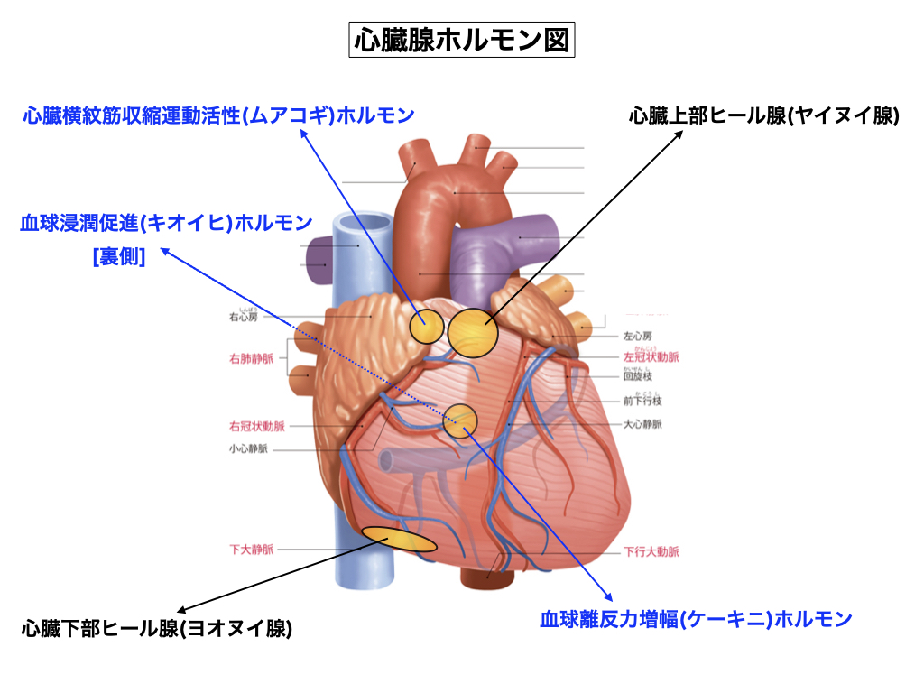 ◎ 心臓下部ヒール腺(ヨオヌイ腺)・・・心臓の下部、右心室の辺りに位置する直径5cm大の半球状のヒール分泌腺で、基本的には心臓ではなくヒール腔に存在しているホルモン腺である。静脈血中に放出されるホルモンであって、このホルモンは炭酸ガスと結合したヘモグロ ビンが肺に至るまでの期間、静脈血の中でガスを手放さない様にさせる「炭酸ガス乖離抑制ホルモン」であり、赤血球内部のヘム原子団に直接作用を及ぼす物理系のホルモンである。ヒール腺の合成は可能。