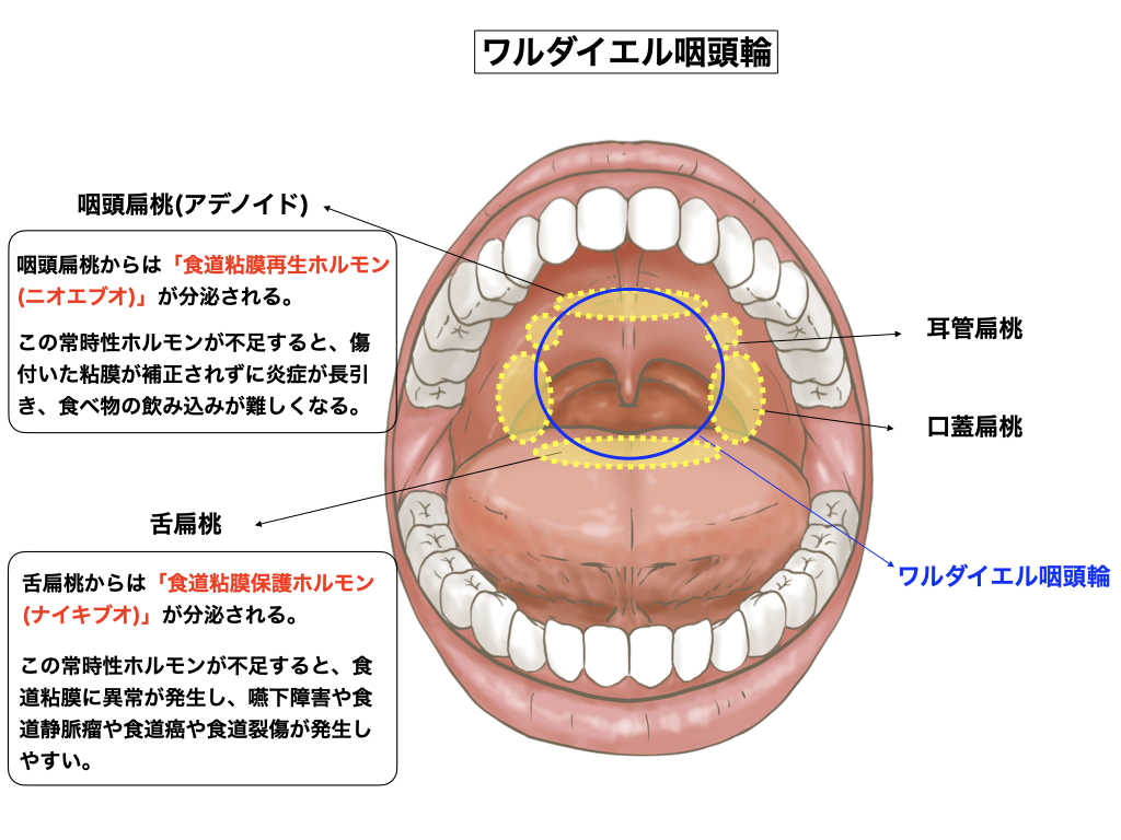 食道粘膜を保護し調整して再生を促す「粘膜ホルモン」は口内の咽頭領域に在って、俗に言う扁桃腺の事である。扁桃と言っても複数個存在しており、医学的には「ワルダイエル咽頭輪(6種類の扁桃から構成される)」と呼ばれる。喉チンコの両脇に位置する左右の「口蓋扁桃」、上顎部の耳管の付け根にある左右の「耳管扁桃」、下顎部の舌の付け根にある「舌扁桃」、上顎部の咽頭に存在する「咽頭扁桃(アデノイド)」と言う六種類であるが、このうちホルモン腺が存在するのは「舌扁桃(下)」と「咽頭扁桃(上)」の二箇所である。「舌扁桃」から分泌されるホルモン(ナイキブオ)は食道粘膜の「粘膜保護ホルモン」であり、この常時性のホルモンの分泌が不足すると、食道粘膜に異常が発生し、嚥下障害や食道静脈瘤や食道癌や食道裂傷(マロニーワイス症候群)が発生し易い。また「咽頭扁桃」から分泌されるホルモン(ニオエブオ)は食道粘膜の「粘膜調整再生ホルモン」であり、このホルモンが不足すると、傷付いた粘膜がいつまで経っても補正されずに炎症が長引くばかりか、食べ物の飲み込みが難しくなる。これらの扁桃腺は場所柄的にウイルス感染が激しく、ホルモン腺の生産細胞そのものがダメージを受けているケースが多い。残念ながら、宇宙医学でもこのホルモンに取って代わる人工ホルモンは開発されていない。