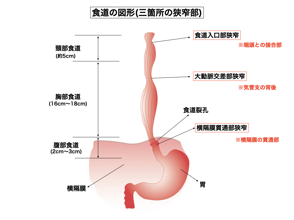 食道にはその構造上、三箇所の狭窄部が存在し、その狭くなった部位から病気が発生するケースが多い。最初の狭窄部は「咽頭との接合部」であり、次が胸の位置で気管支の背後を通る部位、最後が噴門の直ぐ上で横隔膜を貫く部位である。食べ物を良く詰まらせる部位は、最初の咽頭接合部と横隔膜を貫く部位の二箇所であるが、ここは食道癌の高発部位である。消化器粘膜の腫瘍は「LAM腫瘍」が多いと述べたが、食道粘膜に関しては「ラジカル化」した食料や飲料水などと直接接する場所である理由から、特に狭窄部の粘膜には本物の癌が発生し易い。また食道粘膜は胃酸の逆流によって傷付くケースが多く(逆流性食道炎)、アルコール度の高いお酒をストレートで飲むとか、あるいは刺激性のある食べ物とか、舌が火傷しそうな熱い飲み物を呑むとか(食道熱傷)、強い薬剤を服用する場合も粘膜はその度に傷付いている。特に咽喉や食道や気管支には免疫群の司令塔である「肥満細胞(マスターセル)」が多く分布している関係上、外敵の侵入に対して粘膜細胞が免疫群の指令に基づく刺激性の強い「サイトカイン(例えばヒスタミンやロイコトリエンやケモカインなど)」を分泌する事から、その度に粘膜に付加される負担は大きくなる。しかし、上記の粘膜ホルモンが常時分泌されている限りは食道粘膜は常に補修されており、また再生されている。