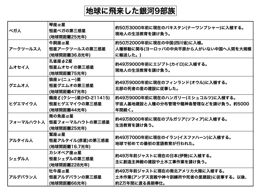 「銀河広域指定民族」の認可獲得とは、惑星に呪縛された人間生命に取って、生きたまま宇宙空間へ出られる唯一無二の手段であり、科学を発達させて宇宙船を開発した所で、肉体や魂体と直結する「位相」や「心動帯」が惑星内に存在する人間には、どう足掻いた所で惑星磁場圏の外には絶対に出られ無いのが現実です。「単独位相」や「船内位相」を創造主や神々に用意してもらわないと、宇宙空間へ出る事は物理的に不可能なのです。地球人はまだその現実(出られないと言う事実)に直面していませんが、人間が独力で出来る事など物質世界の内部だけに限定されています。物質地球の800万倍もの大きさの単独位相を、小さな人間に作れる筈もありません。今から50万年〜49万年前、銀河の夜明け時代に活躍した銀河指定部族の数は約40余り、これらの銀河民族は今はいずれも生き残ってはいませんが、この中から遠距離宇宙船を開発し、地球まで実際にやって来た民族は下記の9部族になります。古い順番から言えば、琴座(リラ)α星の「ベガ人」、牛飼座α星の「アークツールス人」、孔雀座φ星の「ムオセイ人」、狼座ν星の「グエムオ人」、鶴座ξ星の「ヒゲエマイウ人」、南の魚座α星の「フォーマルハウト人」、鷲座α星の「アルタイル人」、カシオペア座α星の「シェダル人」、牡牛座α星の「アルデバラン人」です。