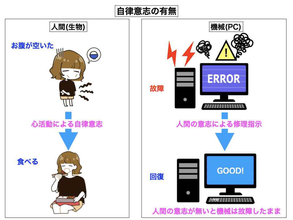 「機械は自力では増殖しないが、生物は自己の複製を作り出して自力で増殖ができる」これが生物の特権(価値)だと考える人もいると思います。しかし、それ(体を増殖させる事)は生物の価値にはなりません。我々創造主が生物が繁殖できる様に霊界環境を整えているから、生物の増殖が可能になるだけの話、機械だって自己の複製を独力でいくらでも作り出せます。我々のcomputerは次世代の高性能computerを自分達の力で開発して作成しています。そんな優秀な機械軍団であるのに、彼等は自分達よりも劣る人間を必要としています。人間(生物)には有って、機械には絶対に無いもの、それは一体何でしょうか。生物の価値とは天体渦に由来する「自律意志」を有している事です。意志とは心活動が生み出す「事を起こさんとする初力」の事であり、自発意欲とも表現できるものです。「お腹が空いたので食べる」と言う行為を生物は簡単に出来ますが、機械にはそれが出来ません。機械が部分的に故障しても、機械にはそれを治そうとする自律意志が無い為に、そのままの状態で居続けます。「故障箇所を治せ」と人間が明確に意志を示さないと、つまり機械に対して命令指揮を下さないと、機械は自らの修理行動すら起こせないのです。