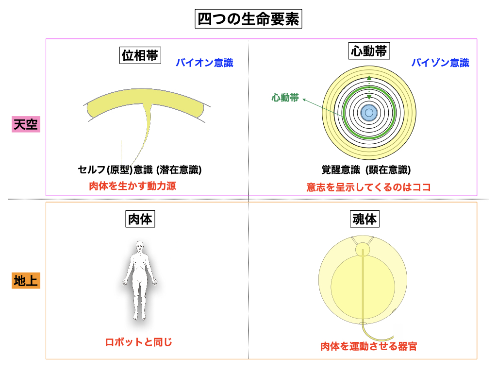 さて、一人の人間が備える基本的な四つの生命要素とは、地上に存在する「肉体」と「魂体」、そして天空に存在する「位相帯」と「心動帯」と言う四種類です。西洋医学では目に見えない人間のアストラル器官の存在を認めていない理由から、肉体という一要素だけで全ての判断を下していますが、実際には役割別の四つの要素から成り立っており、この四要素の中で具体的な「意志」を呈示して来るのは「心(心動帯)」であり、機械生命体にはこの「心」が備わっていないので自発能力が無い事になります。心作用(精神作用)とは天体力場のネブヤハゲル層(第12層〜第10層)が生産する心端子(心動帯)が行う作用の事で、この動帯と地上の魂体が同期されて精神作用が営まれるばかりか、また思考や意志に基づく自発運動を起こす事が可能となります。一般に心とは「覚醒意識」もしくは「顕在意識」と呼ばれるのに対して、位相帯意識の方は「セルフ(原型)意識」もしくは「潜在意識」と呼ばれています。人間の子供の場合は満4ヶ月ぐらいで魂体形成が完了する事から、魂体の完了と同時に心動帯との接続がなされて、意志に基づく肉体運動(ハイハイ運動)が出来る様になります。