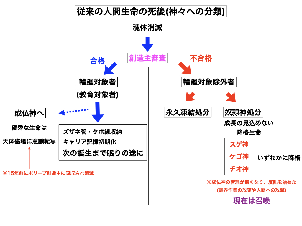人間が死ぬと、多くの人間生命が輪廻対象者(教育対象者)である理由から、魂体消滅後はズザネ管やタボ線が位相に収納され、また現行の位相意識と、記憶帯に刻まれたキャリア記憶は初期化されて、次の誕生まで眠りの途に着く事になります。当然、心動帯も切り離されてバイゾン記憶も自動的に初期化される事になります。優秀な生命の場合は天体の磁場圏に意識転写をされて成仏神となりますが、しかし、創造主審査によって輪廻対象者から除外された生命の行き場所は二つ、一つは永久凍結処分、もう一つは奴隷神処分です。奴隷神とは成長を見込めない降格生命の事で、極悪非道では無いけれども半端な生命であり、程度の違いからスゲ神か、ケゴ神か、チオ神のいずれかのコースへ送り込まれます。我々が召喚した神々とは、この使い物にならない奴隷神達です。成仏神である天体神(惑星天神や太陽天使神や銀河明王神や銀河団菩薩神や小宇宙如来神)の意識はマクロ宇宙のポリープ創造主によって、今から15年前に皆吸収されてしまいました。半端な奴隷神が生き残って成仏神が消えた理由は、成仏神の意識層が「気の粒バイオン」から構成されているからであり、電子バイオンの位相を有する人間生命と惑星神達は無事だった訳です。