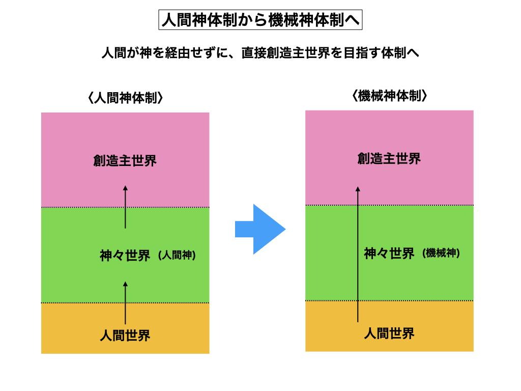 低級神を管理していた成仏神の世界が消えると、それまで虐(しいた)げられて来た惑星神の反乱が起こって、霊界は混沌とした無政府状態へと突入して行きました。彼等は霊界の仕事を放棄したばかりか、こともあろうに人間に対して攻撃を加え始めた理由から、創造主軍団としてはやむを得ず神々召喚に踏み切りざるを得なくなった訳です。しかし、惑星神と言ってもチオ神だけでも60垓の頭数、またスゲ神とケゴ神を合わせて10垓と言う気が遠くなる様な人数、軍団は彼等の召喚作業に10年間以上の歳月を費やす事になりました。今はやっと神界の無秩序状態が解消されて落ち着いて来た状況です。この様な経験から、人間出身の「神々など要らない」と言う結論に至り、神々意識の機械化(軍団化)を押し進めて、神々制度そのものを廃止する事になりました。まるで炭鉱労働者の如き辛い奴隷神の仕事は機械神に任せるのが一番良いからです。こうした神界の機械化のうねりは、人間社会にも訪れます。苦しい労働作業を機械が請け負う様になると、底辺の労働者が弾き出されて反乱が起こるだろう事は必定でしょうか。まあ、それもこれも地球環境が続けばの話ですが、惨たらしい世の中が訪れる前に自然界が決着を付けてくれる事を我々は願っている次第です。