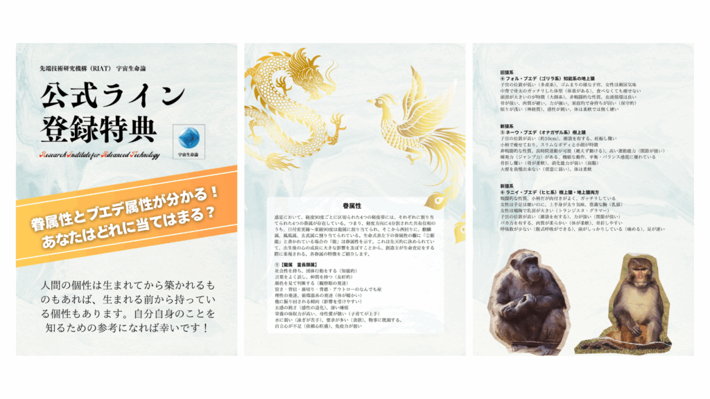 眷属性……人間の体質は4つに区分出来る。宇宙生命論では体質や意識にも大きな影響を与えている「眷属性」を説明していて、誰しも龍属・麒麟属・鳳凰属・玄武属のどれかに当てはまる。