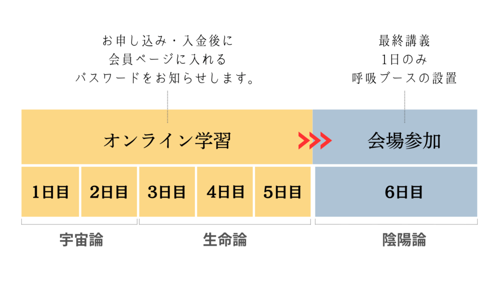 当初、宇宙生命論セミナーは5日間のセミナーでしたが、多くの方にご参加頂けるように数年の間、規模を縮小して2日間の初級編として開催していました。2026年からはオンライン学習を組み合わせる事が可能となり、当初の5日間+1日の合計6日間分規模で、さらにバージョンアップした内容を学ぶことが可能です。最終講義として会場で陰陽論の講義を受けられた方は専用のラインにご案内します。こちらの入室を以て正式な入門セミナー会員とさせて頂きます。